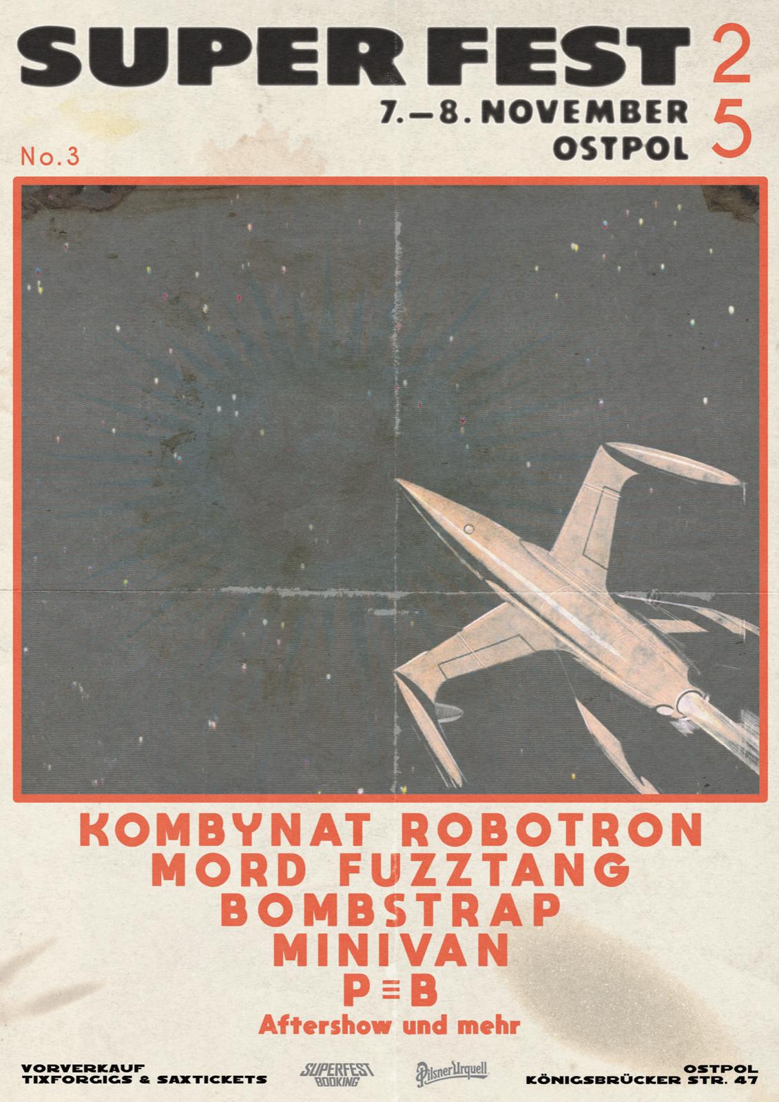 Drinnen wird’s heiß: Der Zwei Tage Ausnahmezustand. Nur du, der Sound – und das Super Fest. Bands: Freitag: Mord Fuzztang / Garage Punk, Psych, Kraut Kombynat Robotron / Kraut, Punk, Noise + Aftershow und mehr. Samstag: MINIVAN / Doom, Acid, Noise, Rock BOMBSTRAP / Terror Punk P≡B / Industrial, Punk, Noise Rock +Aftershow und mehr.